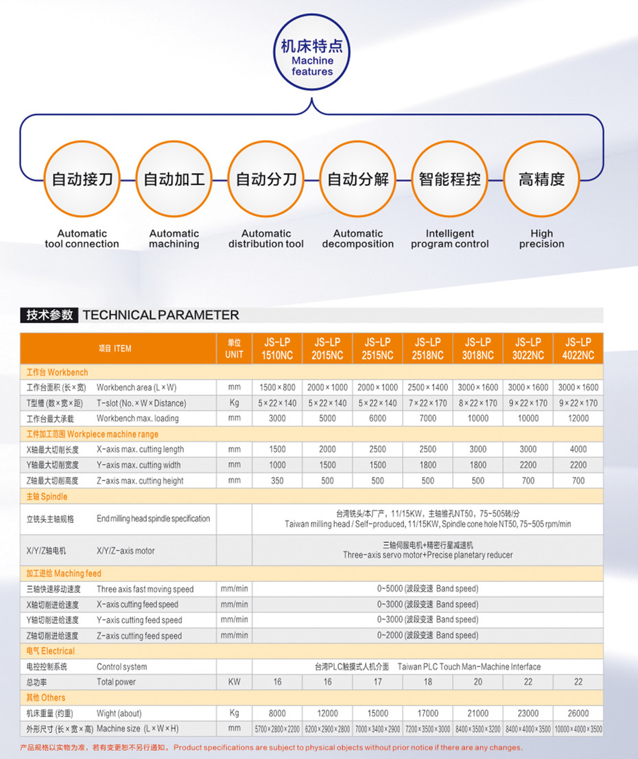 This machine is NC planar precision milling machine with fixed beam, which is equipped with feed frequency conversion speed regulation system and spindle large torque shift speed regulation, and multi-axis control (vertical movement of worktable, lateral movement of vertical milling head, vertical milling head lifting and moving). Automatic processing, automatic positioning, intelligent industrial control, processing steel plate, both sides of the plane rough and fine processing as one, such as heavy cutting die blank, high precision, boring and milling processing application processing equipment.