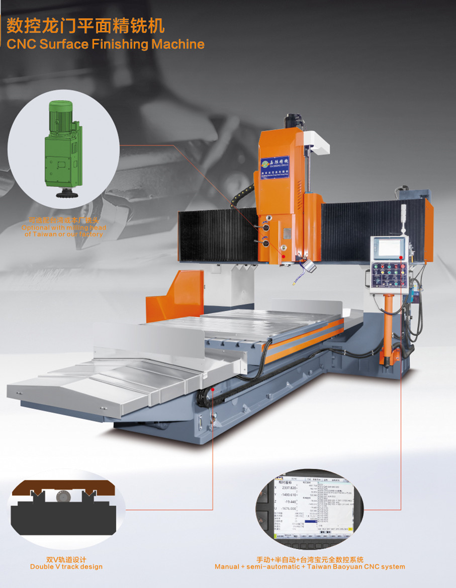 This machine is a fixed-beam CNC planar fine milling machine, equipped with feed servo drive speed system and spindle torque shift speed regulation, multi-axis control (table longitudinal movement, vertical milling head lateral movement, vertical milling head lifting movement). Automatic detection, automatic processing, automatic positioning, CNC intelligent, milling instead of grinding, processing steel plate, both sides of the plane rough and fine processing as one, heavy cutting die blank, high precision, boring and milling machining application processing equipment.